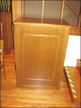 Because space in the chambers was limited, the bass speaker cabinet for the digital stops was custom finished to match the grillwork. The Choir and Pedal divisions are in the left chamber, and the Swell division is in the right chamber.