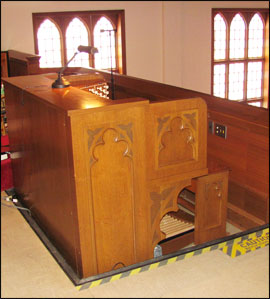 The console is at the front of the loft, facing the choir.